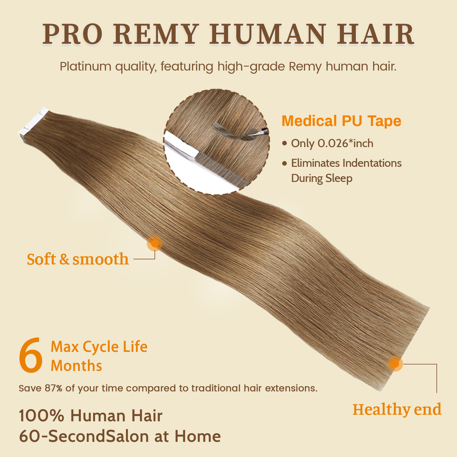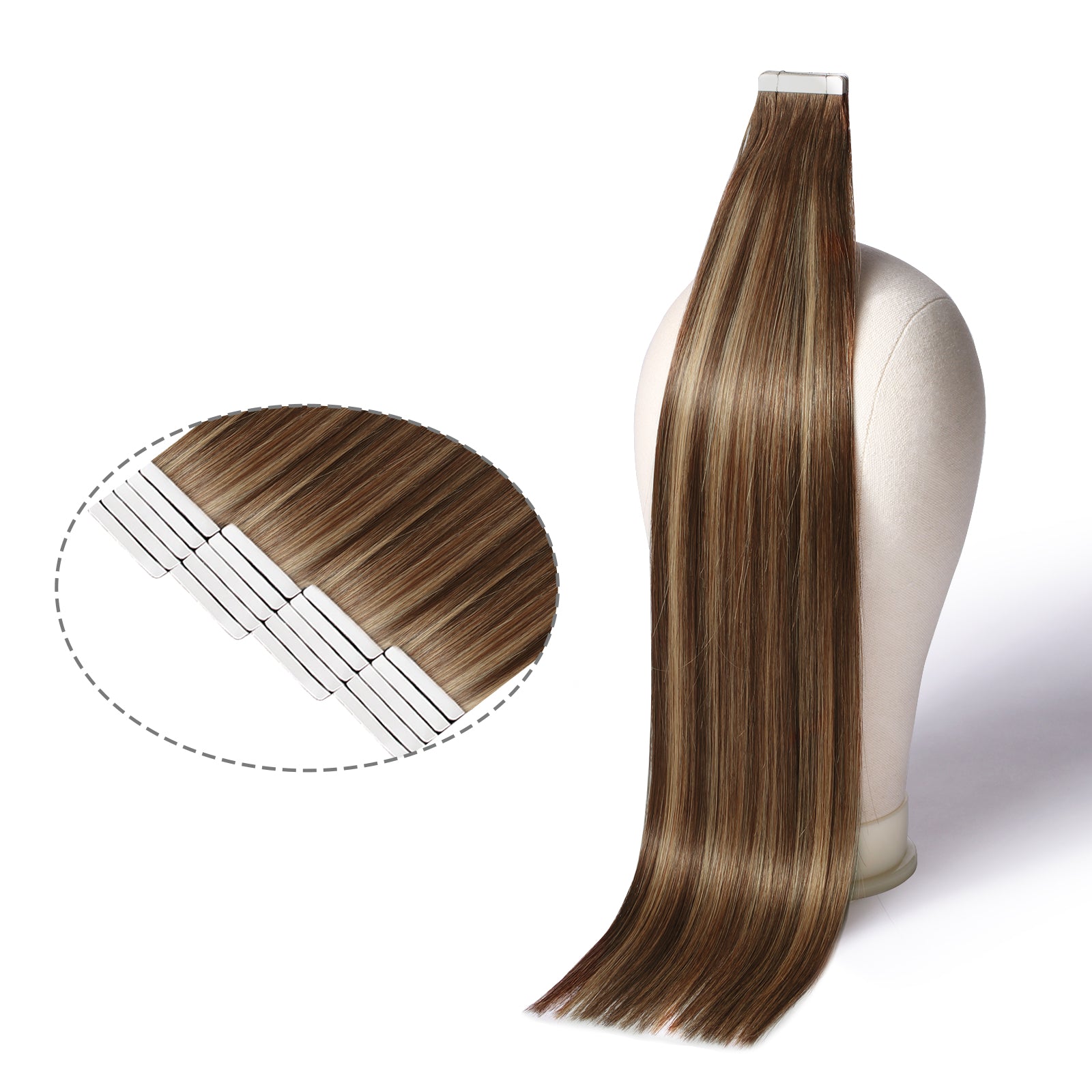 DNE Tape in Hair Extensions Real Human Hair 20Pcs/50g/Pack Seamless #M4/27 Chocolate Brown to Honey Blonde Straight Invisible Double Sided Tape in Hair Extensions for Women/Girls