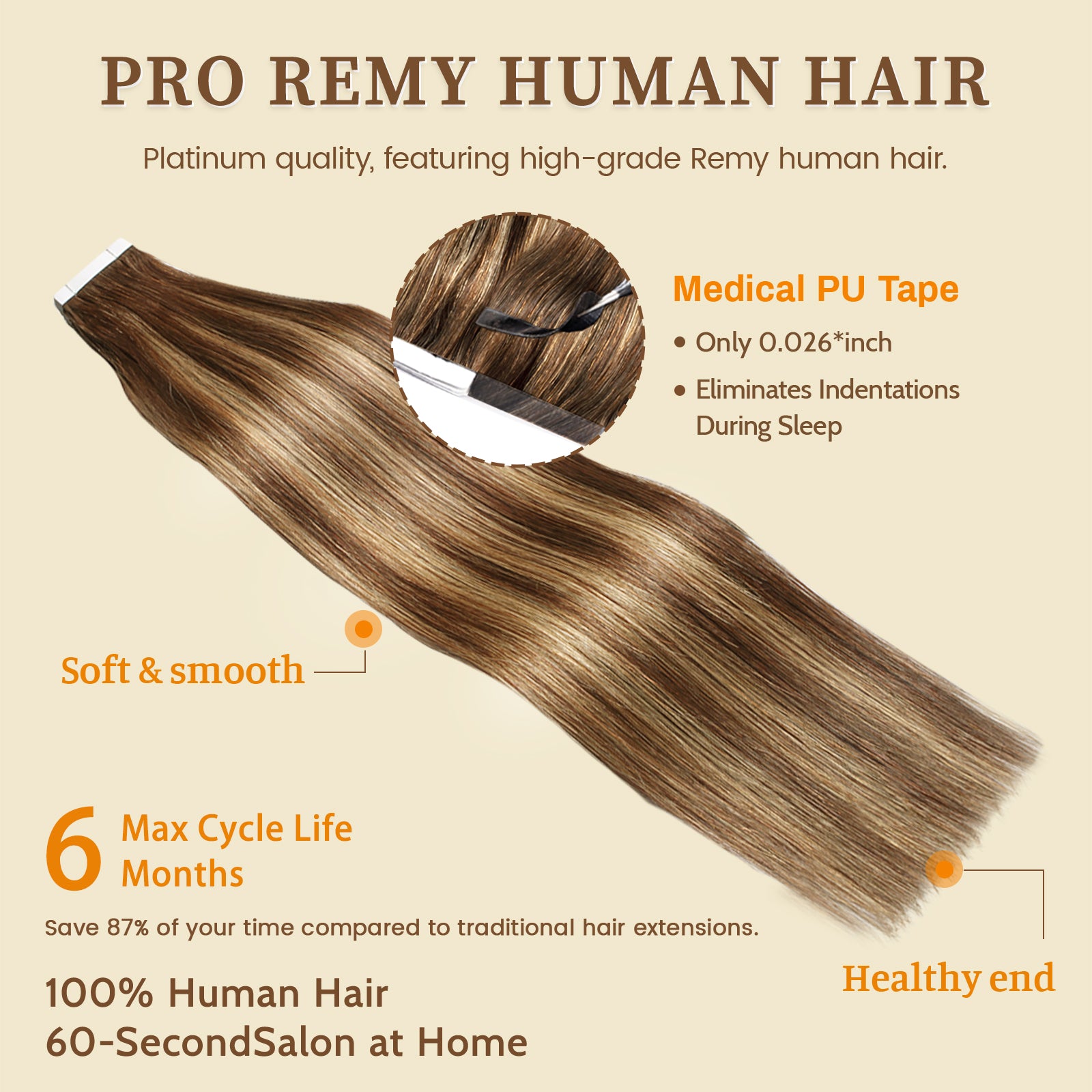 DNE Tape in Hair Extensions Real Human Hair 20Pcs/40g/Pack Seamless Dark Brown to Chestnut Brown#T4-P4/27 Straight Invisible Double Sided Tape in Hair Extensions for Women/Girls